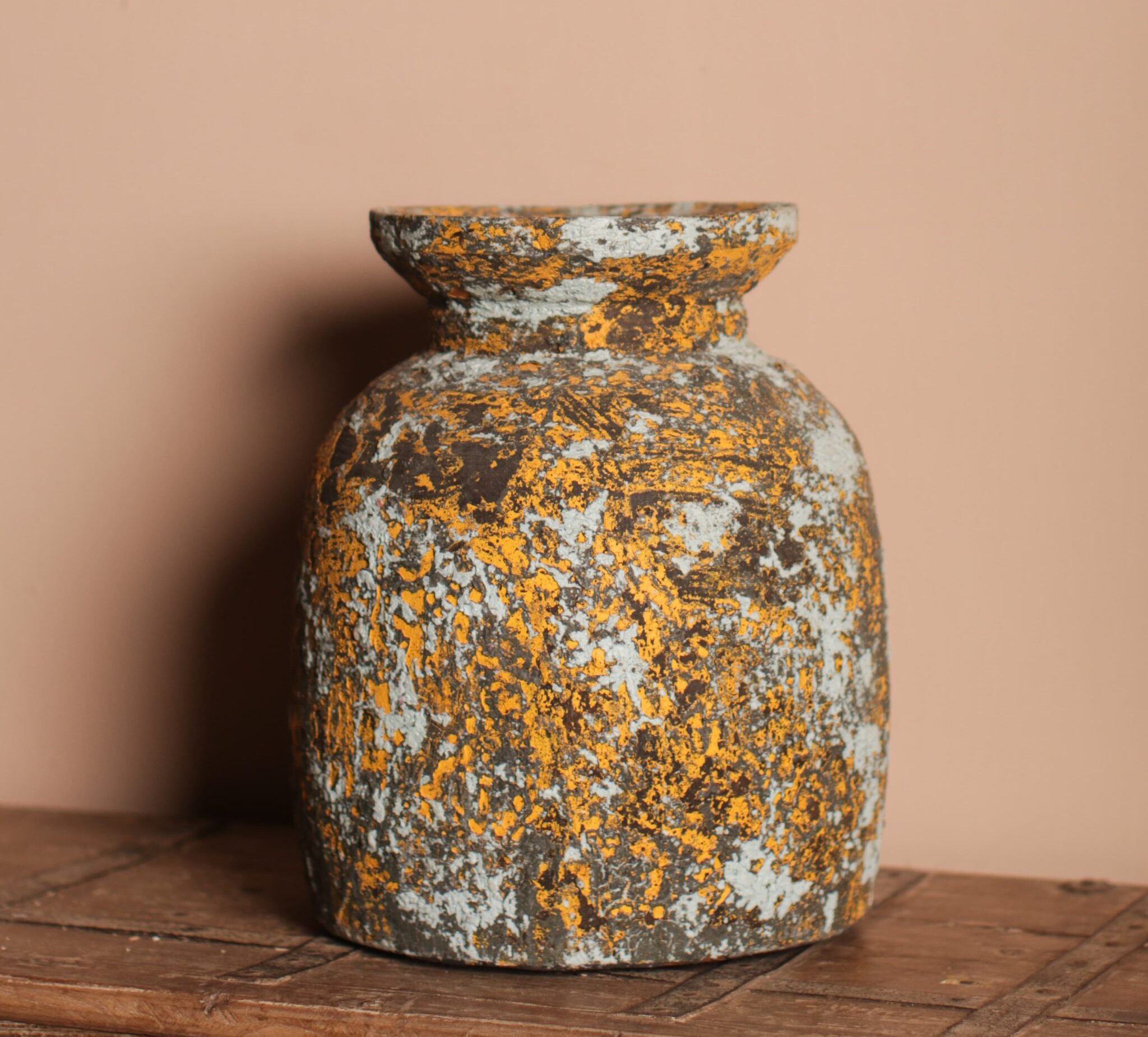 Originally used for storing ghee, this pot now features a striking yellow & blue Pollock design.