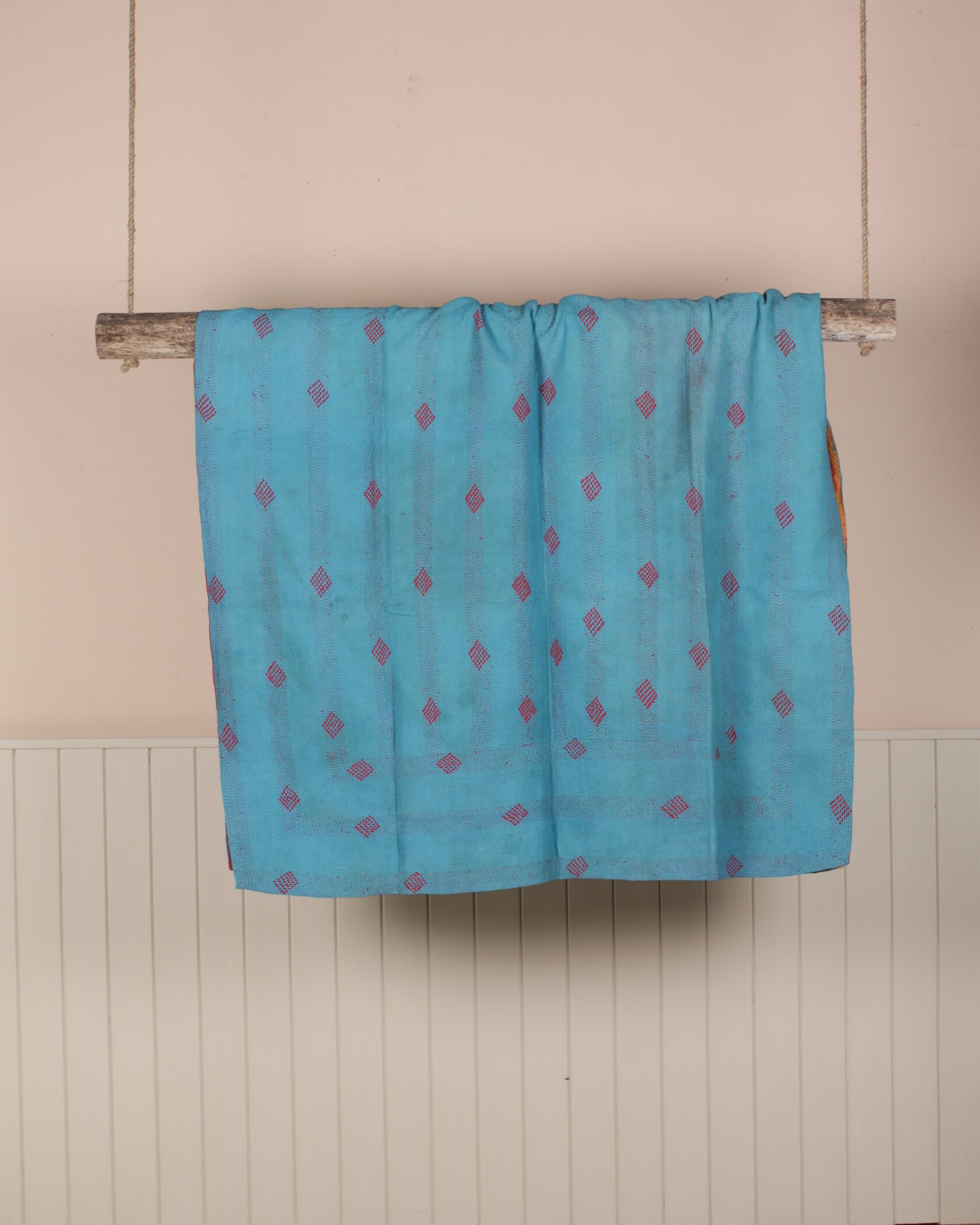 Vibrant Kantha throw adorned in patterns on both the turquoise & yellow sides.