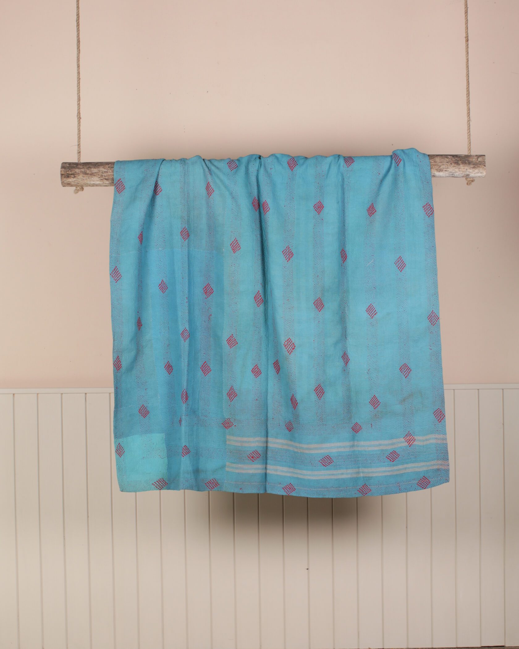 Crafted from soft, reclaimed fabric, this eco-friendly piece is perfect for draping over a sofa or bed or using as a picnic blanket. Handcrafted by artisans, it features detailed Kantha stitching—a traditional Indian technique that involves layers of fabric and running stitches, creating a unique, quilted texture.