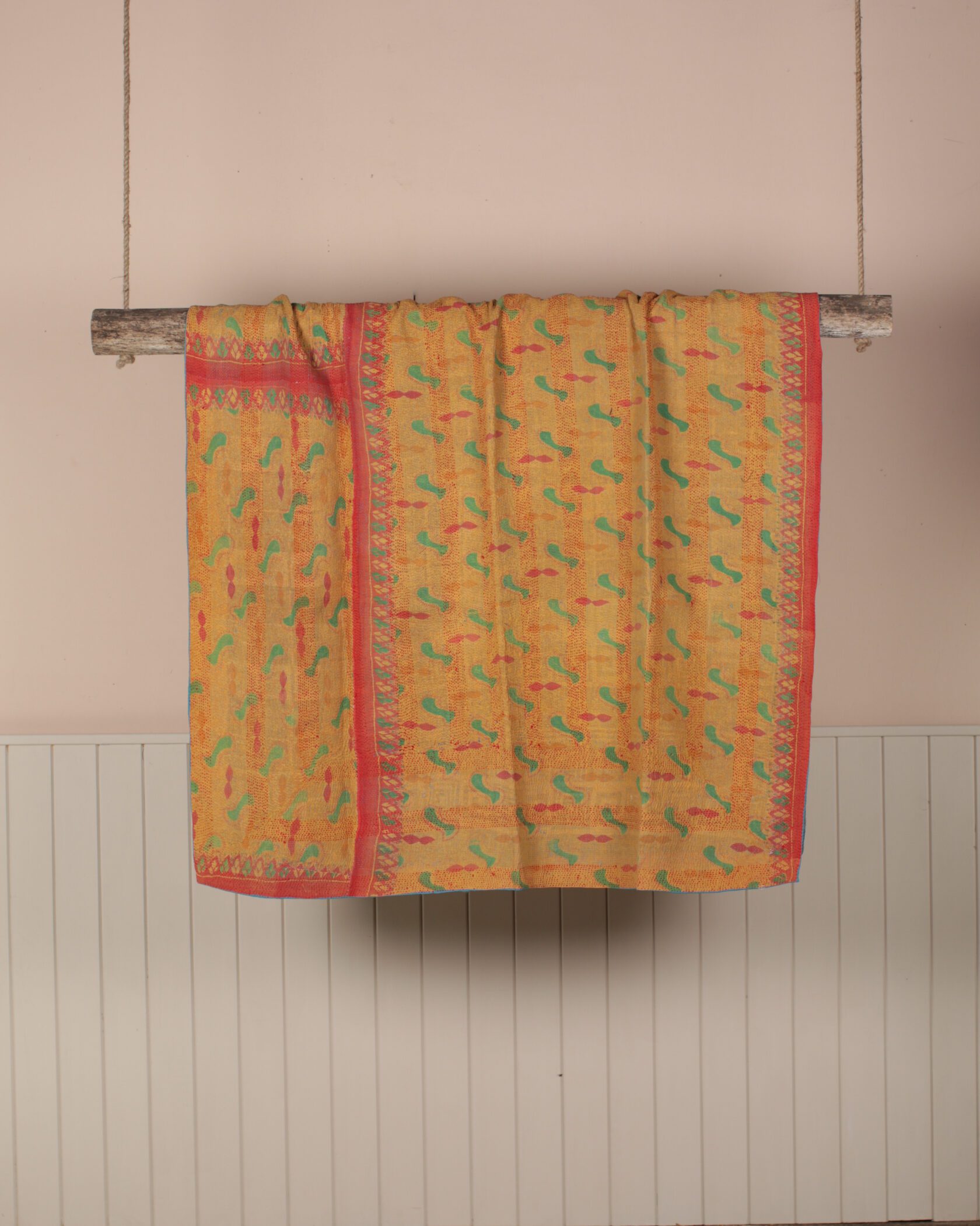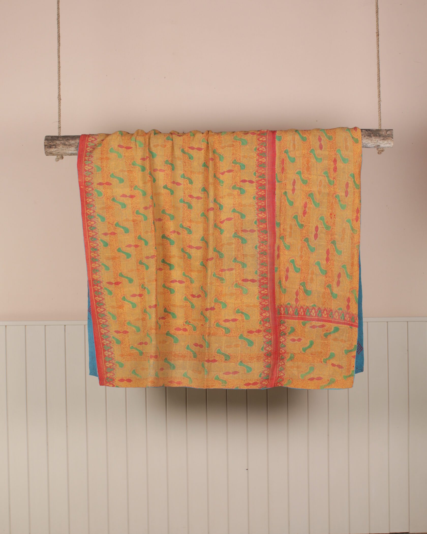 Bold Kantha throw featuring a vibrant combination of colours. One side is turquoise with small diamond motifs in red and the other side is yellow with a playful paisley and floral pattern.